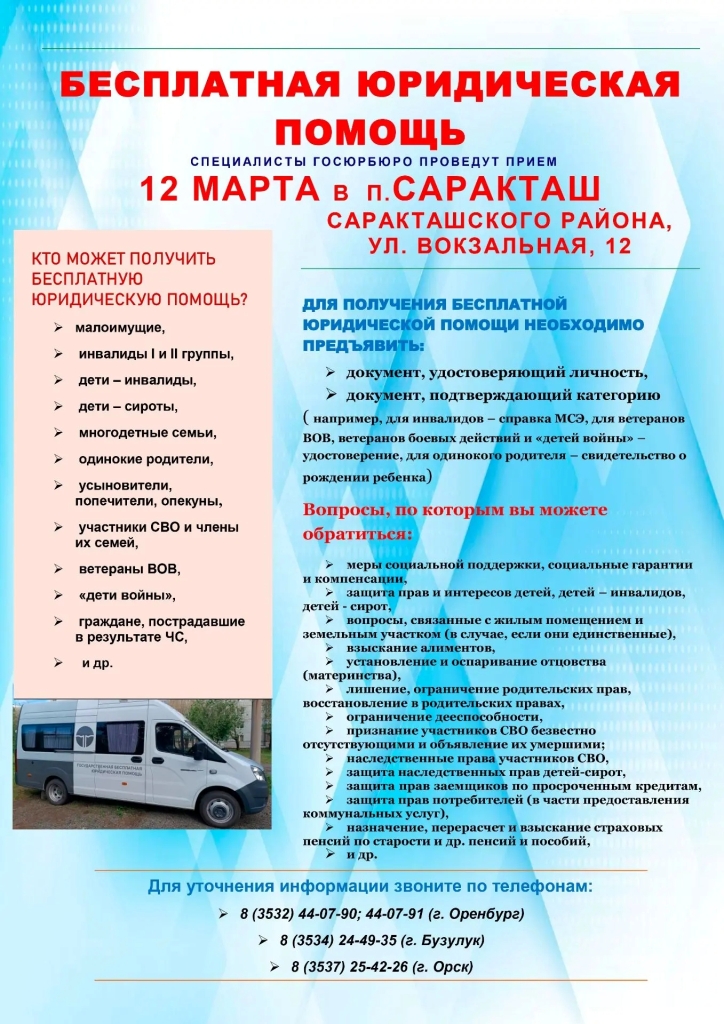 специалисты ГКУ «Госюрбюро Оренбургской области» проведут прием граждан 12 марта в п. Саракташ, ул. Вокзальная, 12 (здание Администрации)